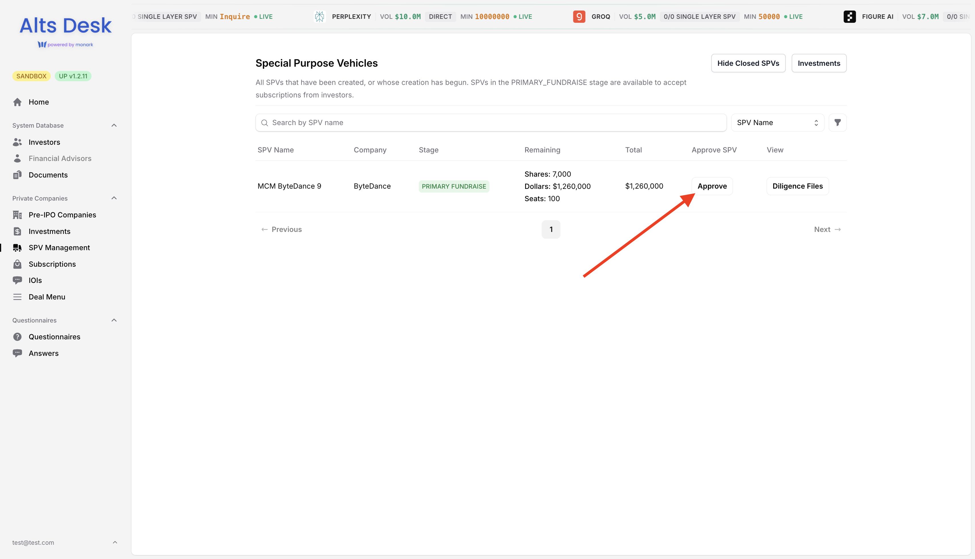 PRIMARY_FUNDRAISE. - SPVs can be approved through the Alts Desk (screenshot below), or via the Approve SPV endpoint.