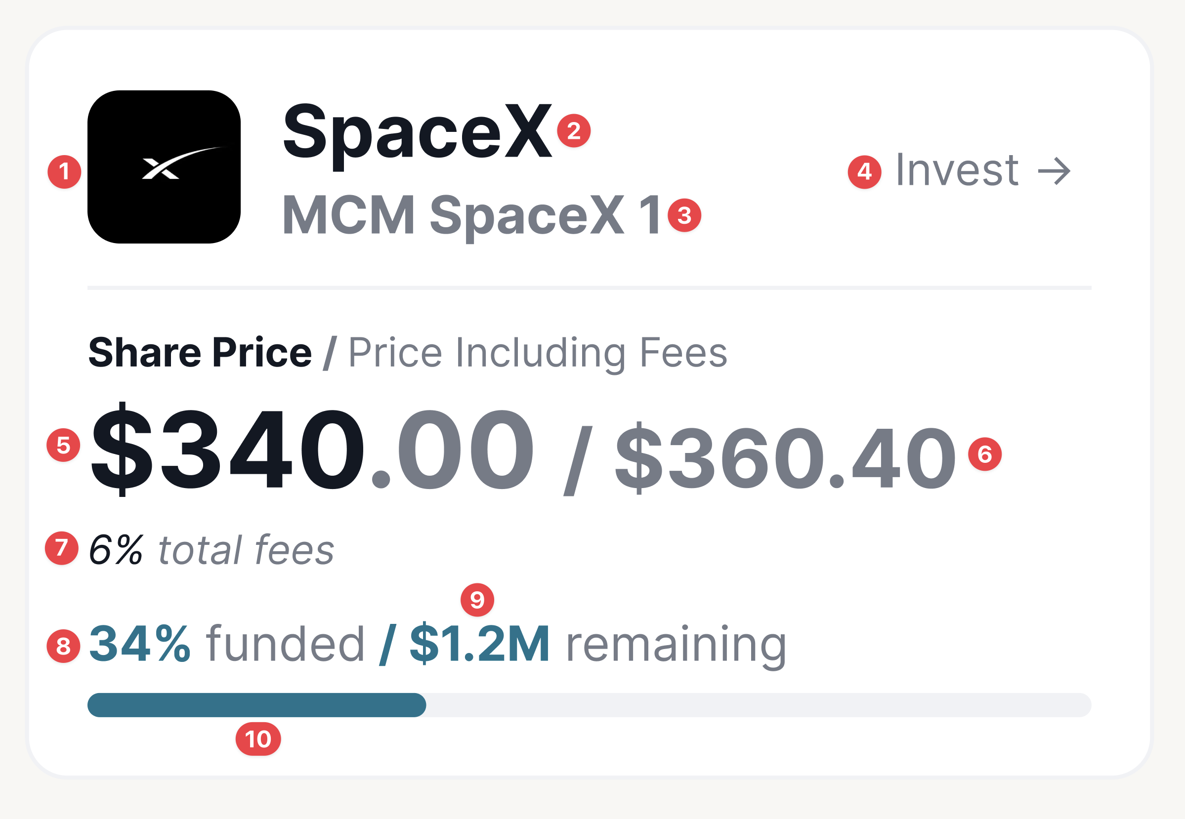 A “marketplace” view of different companies helps new investors organically discover alternative asset investment opportunities. There are three components that should be included in private company marketplace pages: