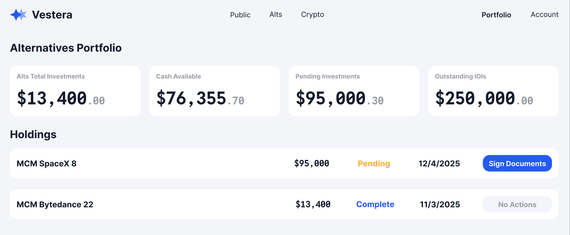 Using the newly created subscription data, we can now show a “Portfolio” view of the user’s currently held alternative investments. This information can be retrieved using the below endpoint:
