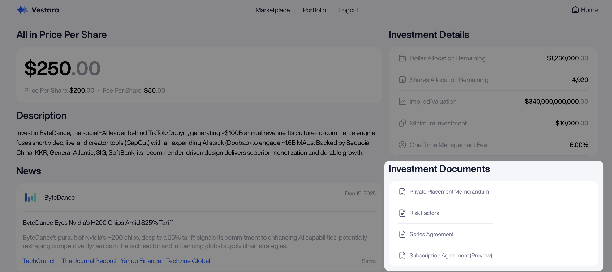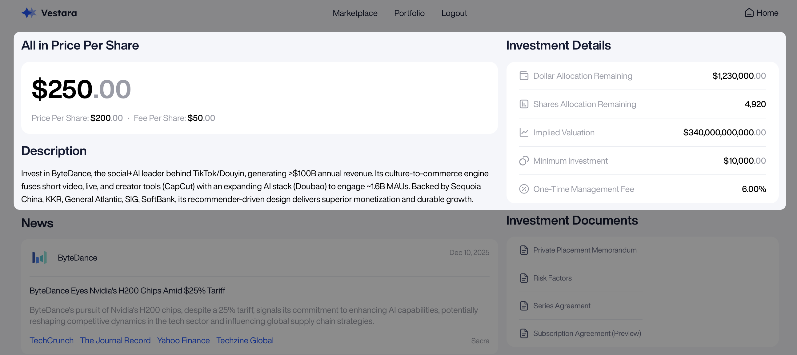 Similar to the view company page, an SPV page would allow a user to view all SPV-specific details necessary to do all necessary diligence before submitting an investment.